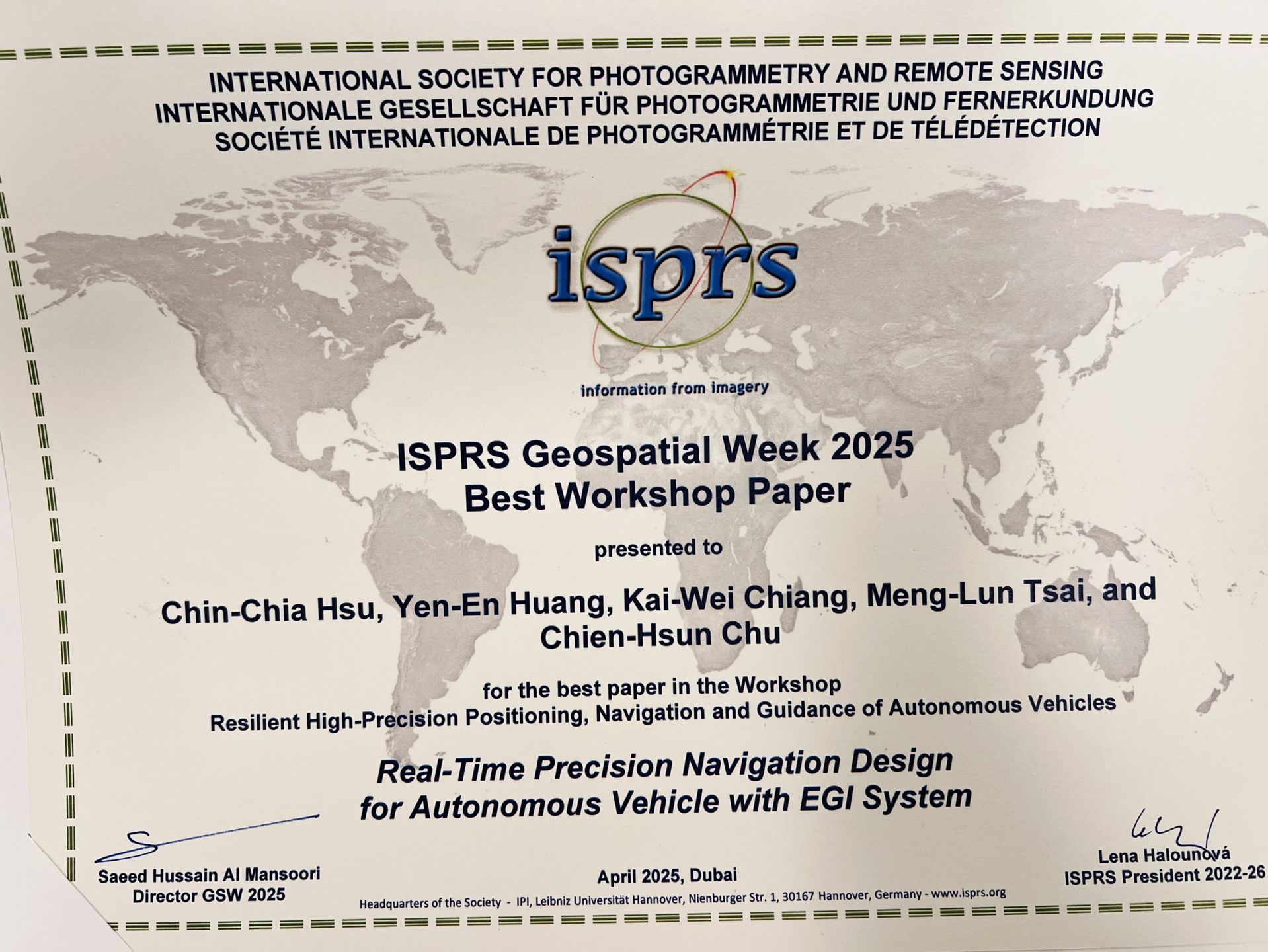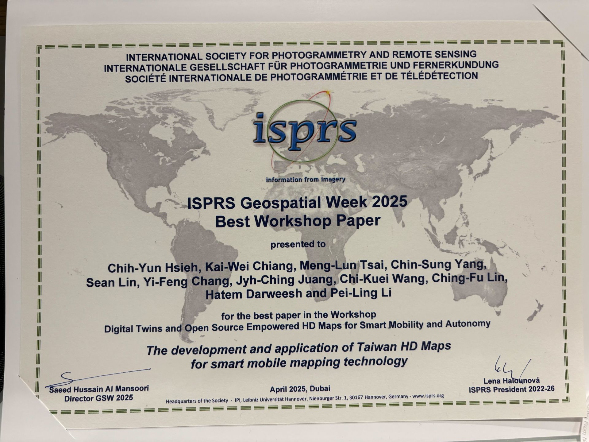 第一篇論文《The Development and Application of Taiwan HD Maps for Smart Mobile Mapping Technology》獲得了Digital Twins and Open Source Empowered HD Maps for Smart Mobility and Autonomy Workshop的最佳論文獎。